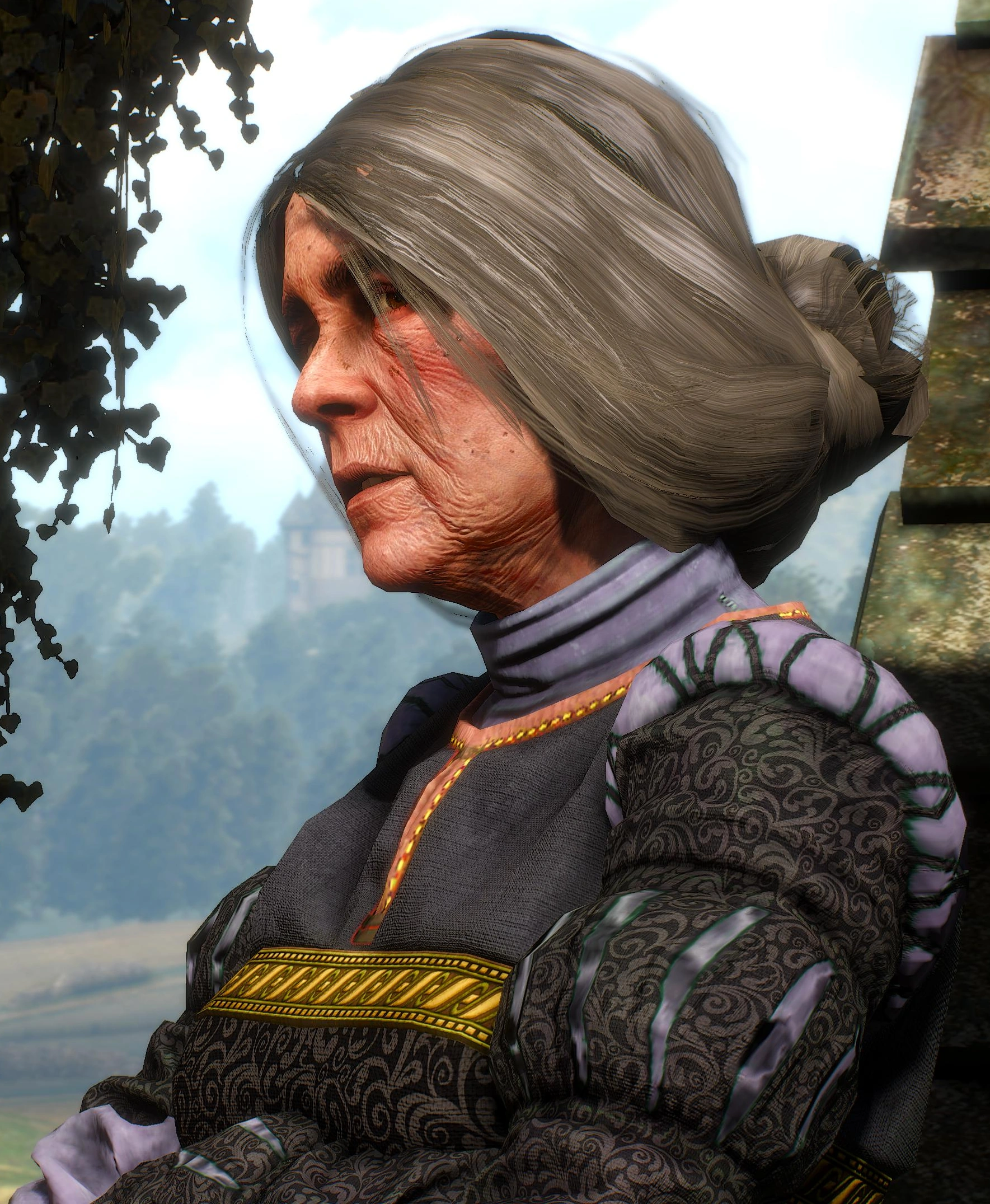 Geralt spotkał ją po raz pierwszy w domu braci Borsodych , przed rozpoczęciem aukcji. Została ona przedstawiona przez Vimme Vivaldiego jako kolekcjonerka viedyminaliów, czyli wszelkich przedmiotów związanych z wiedźmińskim rzemiosłem.