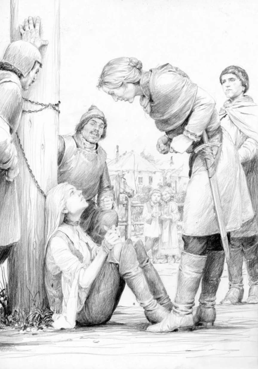 Swoim zachowaniem i wyglądem znacznie różniła się od reszty oddziału Stefana Skellena, mającego zadanie schwytać i zabić Ciri, co sprzeczne było z rozkazami które Skellen otrzymał od cesarza Emhyra var Emreisa)