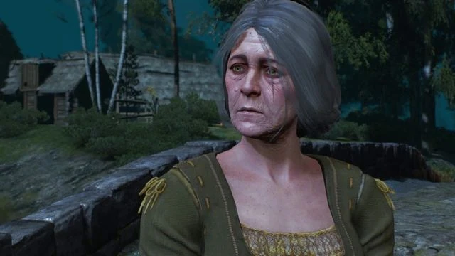 Wiedźmin podchodzi do staruszki, a ta prosi go, aby odniósł jej obrączkę na grób męża, który znajduje się na okolicznym cmentarzu.