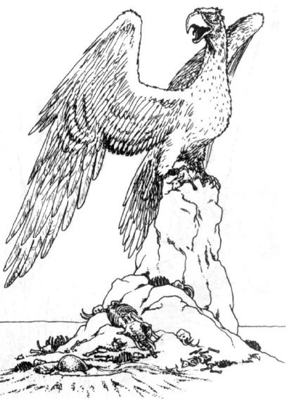 Swoją wielkością dorównuje smokowi. Zwykle nie poluje na ludzi, gdyż preferuje większe ofiary, takie jak np. nosorożce. Zakłada gniazda w górach na wysokich skałach. Dba o złożone jaja i młode. Kiedy wyczuje zagrożenie, bombarduje wrogów skałami i to niezwykle celnie[1].